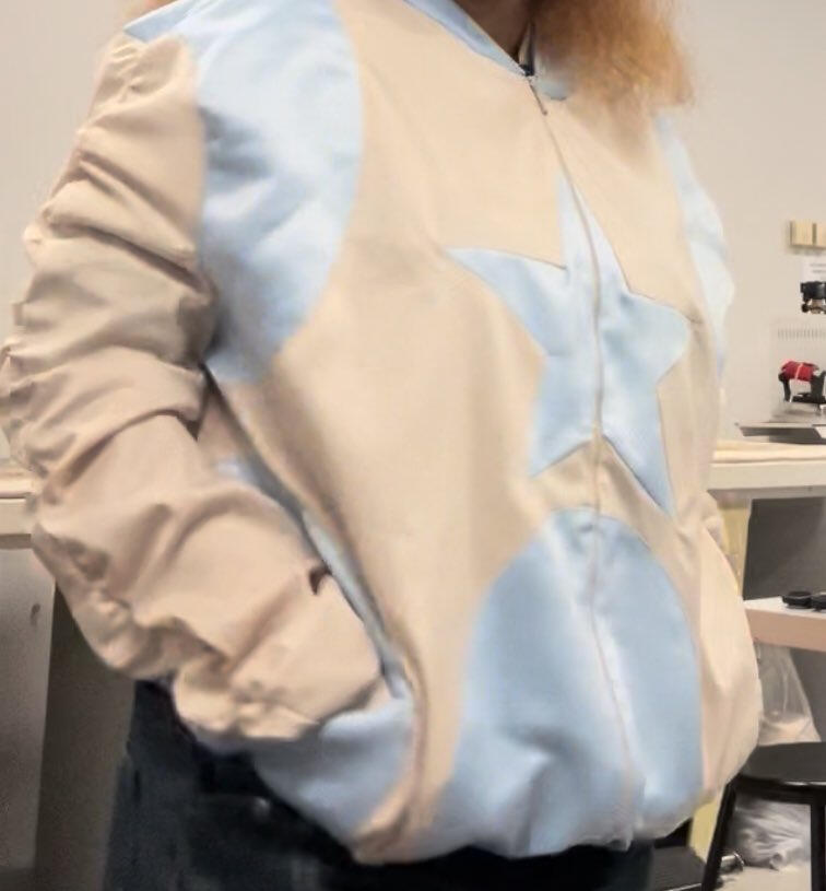 a bomber jacket i designed, drafted, and sewed for my drafting class. made with cotton/polyester and duchess satin.one of my more proud works, especially since my design was complex with lots of curves and sharp edges and i was able to finish it up despite the short timeline i had for this assignment.
